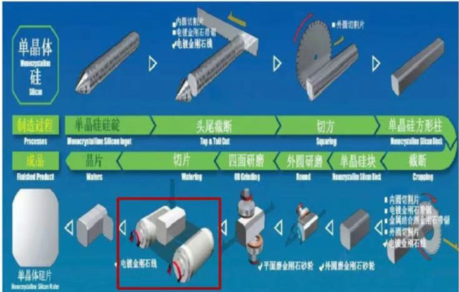 絲杠-也可應(yīng)用在切片機上,絲杠驅(qū)動壓裝機構(gòu)壓緊硅晶,硅晶下端由旋轉(zhuǎn)的金剛線對硅晶進行切割,可取代傳統(tǒng)的砂漿切片。
